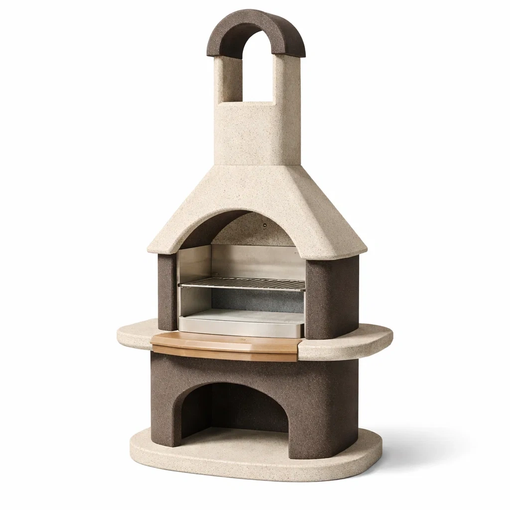 Barbecue extérieur en béton beige et marron avec cheminée et grille en acier inoxydable