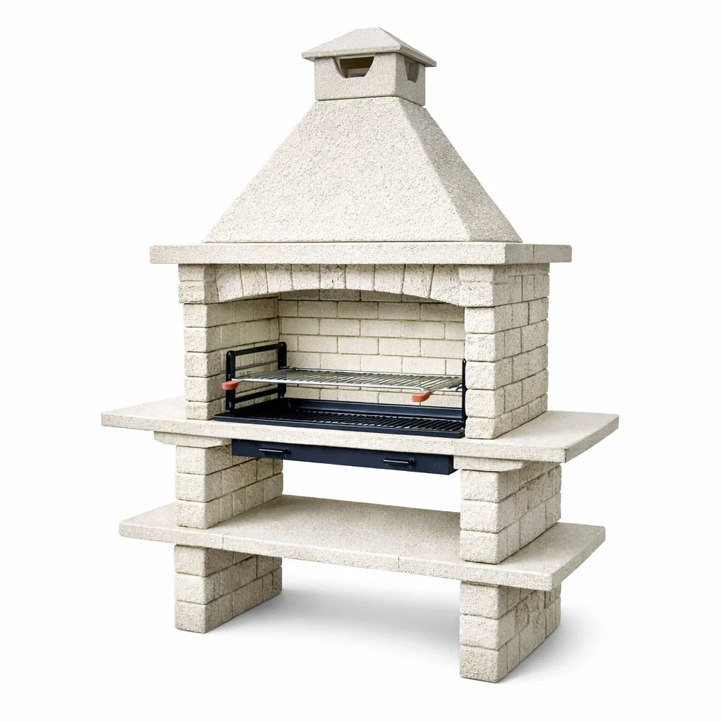 Le barbecue est fabriqué en pierres reconstituées pour l'extérieur et est équipé d'une grille en acier inoxydable.
